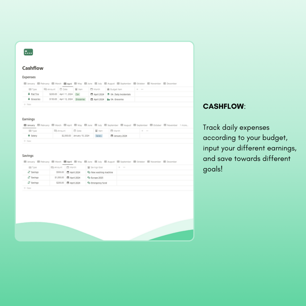 -Cashflow -> track daily expenses according to your budget, input your different earnings, and save towards different goals.