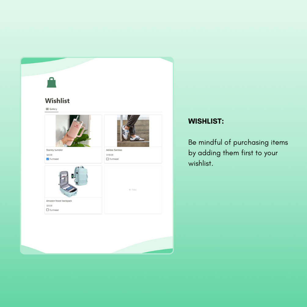 -Wishlist -> be mindful of purchasing items by adding them first to your wishlist.